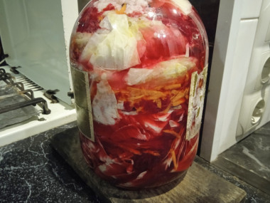 Сделала капусту по этому рецепту. Всё настолько просто, что аж странно почему же так вкусно) На приготовление у меня ушло пол часа. Капусту я нарезала крупными кусками и дольками. Решила, что морковь и свеклу крупно натру. Мне кажется, так овощи больше отдадут цвета. Все овощи сложила в 3-х л банку, чередуя. Соединила все продукты для маринада и закипятила. Залила капусту горячим маринадом, закрыла капроновой крышкой и оставила на кухне. Через сутки попробовала красную маринованную капусту и она уже была готова. Поставила банку в холодильник.