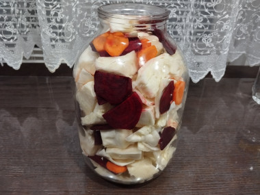 Выкладывайте овощи в чистую простерилизованную банку или иную посуду, которая не будет окисляться при взаимодействии с овощами и маринадом. Овощи распределяйте слоями, равномерно. Сначала белокочанную капусту, сверху слой состоящий из нескольких кусочков свеклы, кружочков моркови и нарезанных зубчиков чеснока. Овощи должны быть уложены в банку плотно.