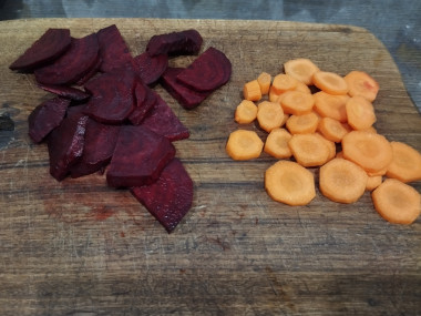 Свеклу и морковь вымойте под проточной водой с щеткой, очистите. Свеклу разрежьте на кусочки произвольной формы и размера, можно порезать ножом просто дольками.