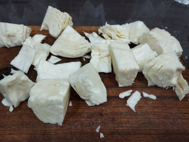 Зубчики чеснока очистите от шелухи и нарежьте слайсами или крупными кубиками.