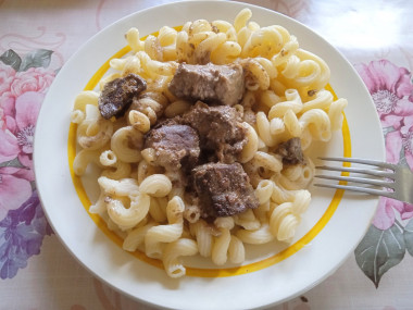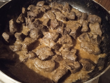 Решила готовить печень, но свиную. Нашла этот рецепт и взяла его за основу. Любая печёнка в сметане это прекрасное сочетание. Обжарила лук на масле без запаха, но без моркови по своим соображениям. Добавила кусочки печени и обжаривала несколько минут, помешивая. Добавила заливку и тушила побольше, чем указано в рецепте, минут 20. Параллельно отварила макароны.