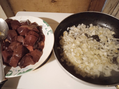 Приготовим ингредиенты для блюда. Куриную печень, если она была замороженной, размораживаем, моем, срезаем лишний жирок и пленочки. Нарезаем куриную печень на кусочки, но они не должны быть слишком маленькими, достаточно разрезать на 3-4 кусочка, чтобы не пересушить ее при обжаривании. Еще раз промываем ее, чтобы удалить кровь, даем воде полностью стечь с продукта.