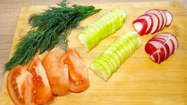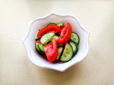 В салатник выложите дольки помидоров, кружочки огурцов, рубленые кинзу и укроп.