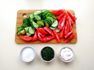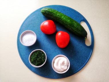 Как сделать салат из помидоров и огурцов с майонезом? Подготовьте необходимые ингредиенты. Помидоры можно взять любые: обычные, черри. У меня коктейльные томаты. В качестве заправки можно добавить сметану, йогурт, оливковое или подсолнечное масло. Зелень можно использовать любую: укроп, петрушку, зеленый лук, базилик. Дополнить салат можно очищенной и нарезанной тонкими полукольцами репчатой луковицей, сладким болгарским перцем или сыром фета.