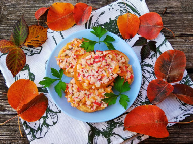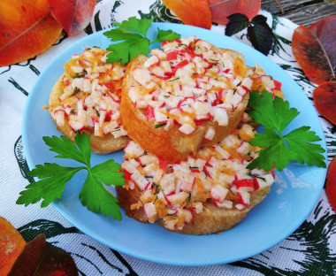 Очень необычные по вкусу горячие бутерброды)) когда все привычные завтраки уже надоели и не знаешь, чем порадовать семью, прям выручают)) наткнулась случайно на этот рецепт и поняла, что в морозилке как раз есть пол пачки оставшихся палочек! Не пожалела, очень вкусно! Единственное, что я решила запечь их в духовке, чтобы были менее жирными и укропом посыпала свежим при подаче к завтраку) мне больше нравится, когда зелень не обработана термически!)