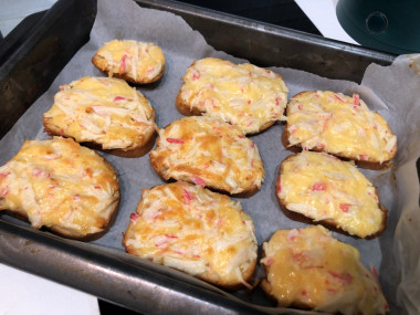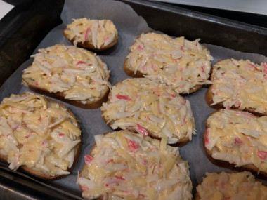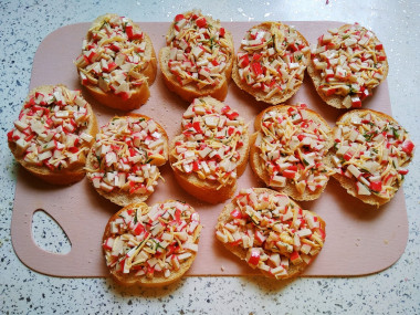 На одну сторону багета выложите по 1-2 ст. л. крабовой начинки и примните ложкой, чтобы слой начинки был равномерным и не выходил за края хлебного ломтика.