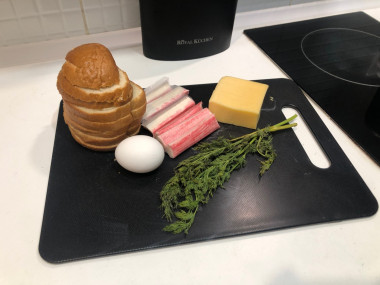 Как сделать горячие бутерброды с крабовыми палочками, яйцом и сыром? Подготовьте все необходимые ингредиенты. О том, как выбрать крабовые палочки, читайте в конце рецепта. Крабовые палочки можно заменить креветками. Помимо пшеничного можно использовать ржаной багет, а также обычный черный или белый хлеб. Чеснок можно убрать, а остроту придать с помощью молотого чили на кончике ножа или мелко порезанного кусочка свежего острого перца.