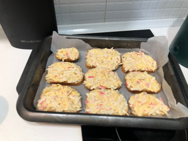 Бутерброды очень вкусные! Съели все сразу. Кусочки батона поджаренные, румяные и хрустящие. Начинка тоже прекрасная. Дочка у меня вообще крабовые палочки не признает, а тут пару бутербродов умяла за раз) А мне больше всего понравился поджаренный сыр) Спасибо за рецепт!