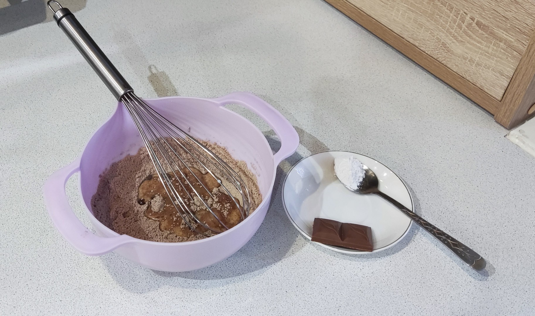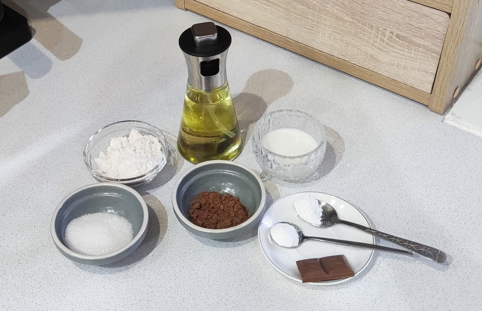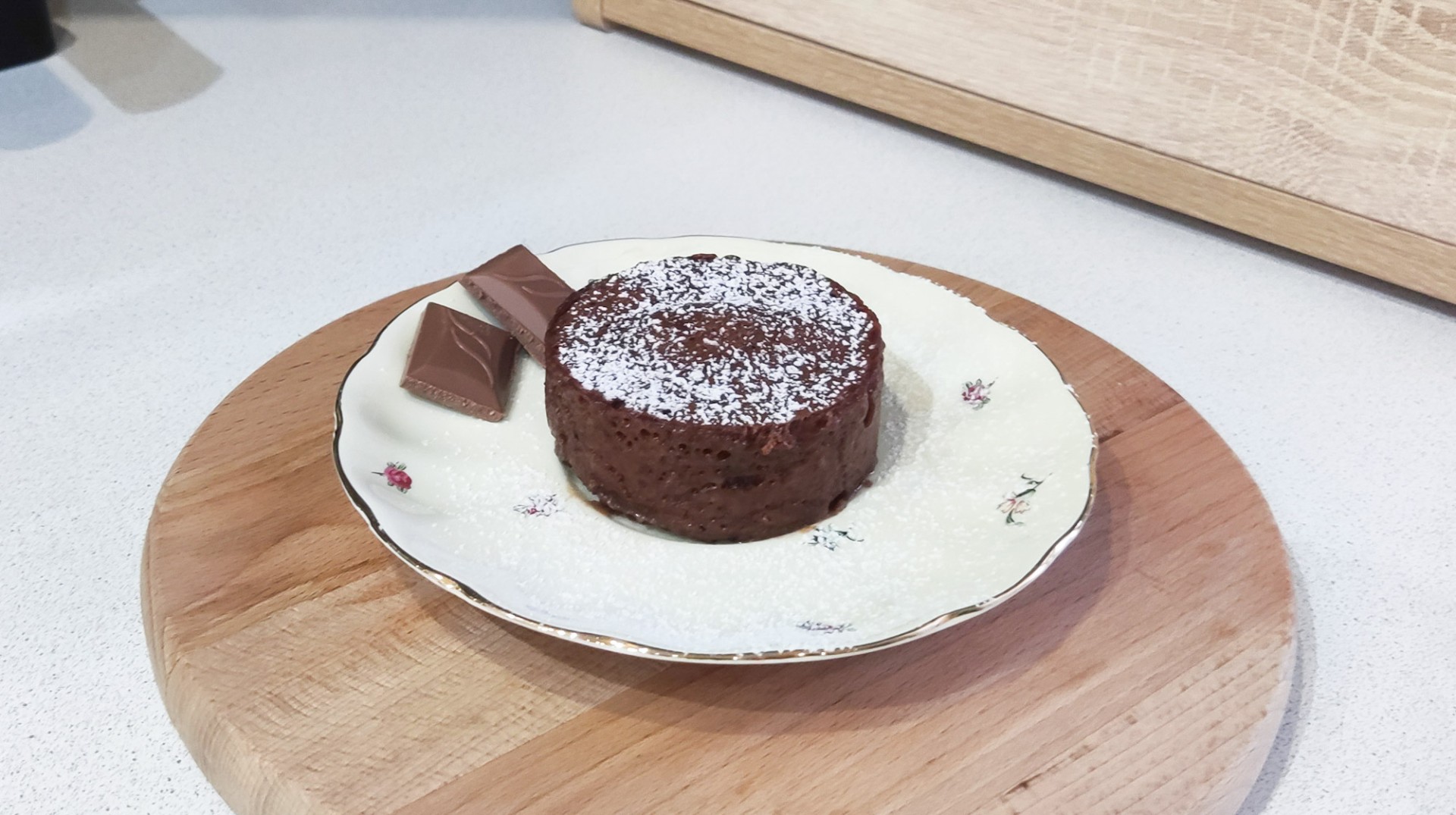Я решила приготовить одну порцию шоколадного кекса в кружке в микроволновке. Для этого взяла пшеничную муку высшего сорта, натуральный какао-порошок без добавок, сахар, молоко жирностью 1,8%, растительное масло без запаха, разрыхлитель и соль. Сухие ингредиенты просеяла с помощью кружки-сито. Тесто получилось густое, поэтому я добавила ещё немного молока. Шоколад положила молочный. Я боялась передержать кекс в микроволновке, поэтому шоколад у меня стал мягким, но не потёк. На вкус, я думаю, это не повлияло, потому что получилось вкусно. Подавала десерт не в кружке, перед подачей посыпала сахарной пудрой. Хороший рецепт быстрого десерта.