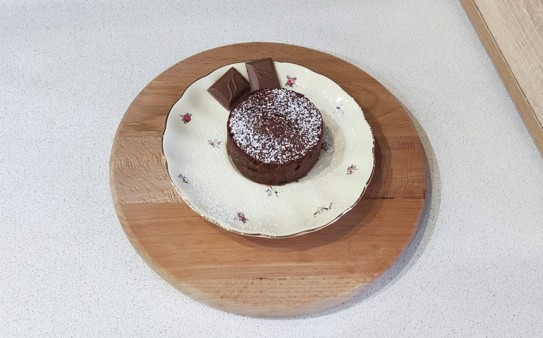 Дальше, по желанию, можно выложить в кружки по небольшому кусочку горького или молочного шоколада. Тогда кексы получатся с жидким центром, как у меня на фото. Но это совершенно необязательный шаг! Можно сразу распределить всё тесто поровну между кружкам, не добавляя шоколад.