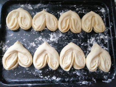 Таким же образом сформируйте остальные плюшки и выложите их на смазанный растительным маслом противень. Смажьте плюшки остатками растопленного сливочного масла или немного взбитым яйцом и отправьте их в разогретую до 200 градусов духовку на 30-40 минут. Точное время зависит от мощности вашей духовки.