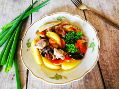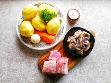 Мясо взяла нежирное, мягкое - свиной карбонат. Из овощей - картошку, морковь и репчатый лук. Захотелось добавить еще парочку шампиньонов (у меня они были замороженные), которых не было в рецепте.
