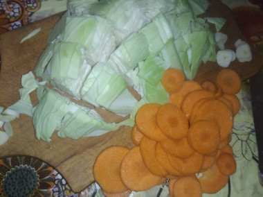 Очистите капусту от верхних сухих и грязных листьев. Кочан разрежьте на несколько частей, вырежьте кочерыжку. Капусту нарежьте кусочками или кубиками среднего размера.