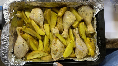 Когда готовлю картофель, то для себя уже выработала систему со своей духовкой, сначала накрываю фольгой, а в середине готовки ее снимаю, тогда картофель точно приготовиться вместе с курицей.