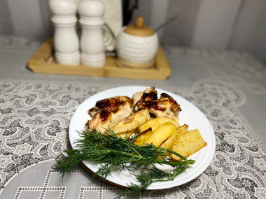 По этому рецепту можно запечь курицу или цыпленка целиком, разложив картофель вокруг тушки.