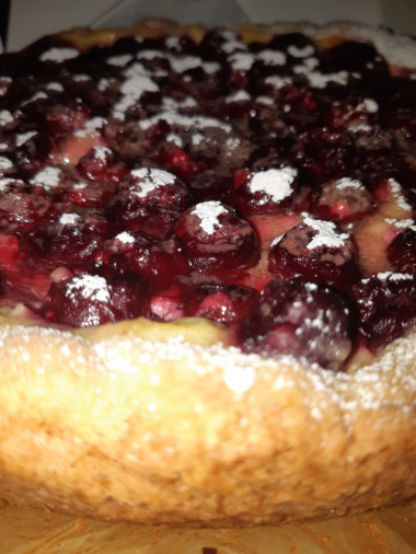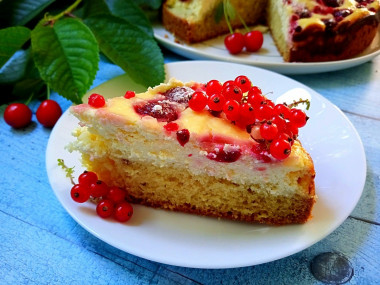 Давно хотела испечь пирог с творогом и вишней, мне очень нравится такое сочетание. Обычно такие пироги бывают с песочной основой, а я не очень люблю песочные коржи) А в этом рецепте совпало все, что мне нравится! Тесто для основы замесила так же как и указано в описании. Масло у меня было замороженное, а чтобы долго не ждать, разморозила его в микроволновке. Для этого нарезала его маленькими кусочками, поставила в микроволновку и установила режим "разморозка фруктов" 300 г. В итоге идеально мягкое и абсолютно не жидкое масло готово) Готовое тесто получилось похожим на хороший масляный крем, выглядит очень аппетитно)) Для творожного слоя все продукты взбила погружным блендером, яйца взяла мелкие, чтобы начинка не получилась жидкой. Вишни было мало, буквально последнюю с дерева сняла и в дополнение добавила горсть красной смородины. Сверху слегка присыпала крахмалом, смешанным с сахарной пудрой. Выпекала пирог 55 минут, т. к. порцию продуктов увеличила вдвое. Пирог у меня вышел большим, хватило всем гостям) Перед подачей охладила в холодильнике, мне кажется это улучшает вкусовые качества творожной выпечки. Что касается самого пирога: корж получился пышным, сочным, пористым; творожная прослойка тоже сочная, нежная, похожа на запеканку; вишня и смородина замечательно вписались в начинку, ничего не потекло, все пропеклось. Вкус пирога шикарный! Всем рекомендую!