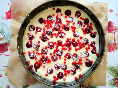На него положите вишню в крахмале. Равномерно распределите ее. Выпекайте пирог в предварительно разогретой до 180°С духовке около 45 минут. Время и температура указаны приблизительно, ориентируйтесь на особенности работы ваше духовки. О духовках читайте в статье в конце рецепта.