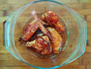 Поскольку я готовила это блюдо впервые, то делала всё строго по рецепту. Сначала я приготовила маринад, затем перемешала в нём крылья и запекала их в духовке около 40 минут. Время приготовления может варьироваться в зависимости от особенностей вашей духовки.