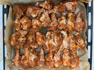 Затяните емкость с крылышками пищевой пленкой и поставьте мариноваться в холодильник на 5 часов, а лучше на всю ночь - так мясо лучше пропитается маринадом, будет сочнее и ароматнее. Периодически встряхивайте крылышки, чтобы маринад распределялся более равномерно.
