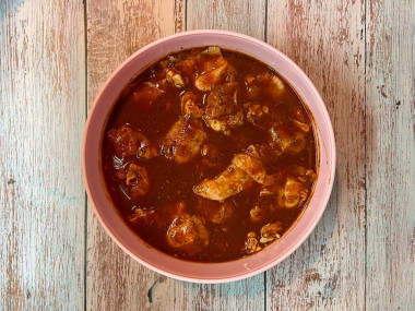 Все хорошо перемешайте, чтобы томатный маринад равномерно распределился по всем крылышкам.