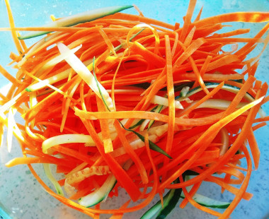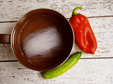 Как сделать салат Фунчоза с овощами по-корейски? Сначала подготовьте и отмерьте все необходимые продукты. Морковь вымойте под проточной водой с щеткой, обсушите. Огурец и болгарский перец также вымойте под проточной водой и обсушите.