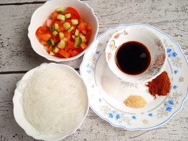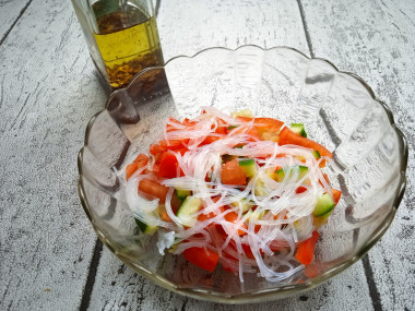 Азиатская кухня не совсем привычная для нас. А вот по этому рецепту привычный для нас, обыденный салат с простыми овощами можно превратить в экзотический. Причем времени это займет всего на несколько минут дольше, чем приготовление банального овощного салата, зато принесёт изящную азиатскую изюминку вашей трапезе. Всего – то нужно залить кипятком фунчозу и добавить пикантных специй. И банальный овощной салат заиграл новыми вкусовыми нотками.