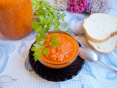 Привезли мы с дачи домашние овощи в большом количестве и я решила сделать аджику. Нашла этот рецепт, всё очень просто и быстро, без длительной варки, без заморочек. Всё было в наличии. От себя ещё добавила немного репчатого лука. Все овощи помыла, почистила и порезала. Измельчила в кастрюле погружным блендером, что очень удобно и быстро. Добавила соль и свежемолотый перец. Аджика настаивалась часик и после мы уже снимали пробу. Вкусно, сочно, ароматно!!!