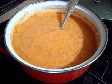 Все ингредиенты положите в глубокую емкость или кастрюлю из неокисляющегося от овощного сока материала — нержавейки или эмалированную. С помощью блендера измельчите все ингредиенты в пюреобразную массу. Вместо блендера можете использовать обычную мясорубку.