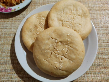 Испекла лепешки на воде в духовке. Рецепт самый простой! Продукты - самые элементарные! Замесила тесто на воде и поставила его в теплое место. Когда оно подошло, обмяла его и сформировала лепёшки. Как и предложено автором сделала на них надрезы и посыпала кунжутом. Получились пышные, вкусные лепешки с хрустящей корочкой. Всем домашним очень понравилось!