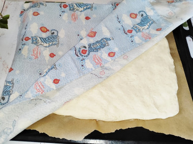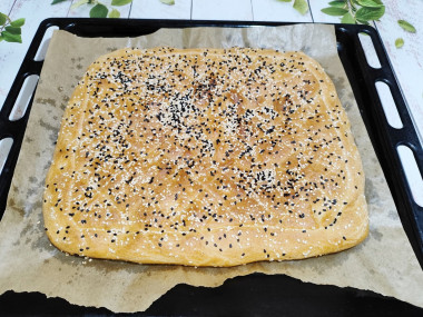 Тесто замешалось легко и быстро, подошло через 1.5 часа. Постное масло придаёт тесту эластичность. У меня ушло 40 мл. на тесто. Я решила раскатать на большой противень одну лепёшку. Оставила на расстойку под полотенцем на 40 минут.