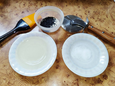 Ролик для вырезки узора. Масло для нанесения на лепёшку с помощью кисти. Кунжут и мелкая соль для присыпки.