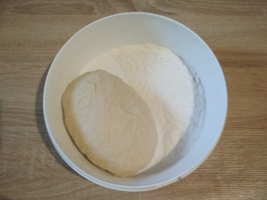 Выложите тесто на стол и вымесите до однородности. Если необходимо, добавьте еще немного муки. Тесто не должно липнуть к рукам. Оно получается мягкое, эластичное. Накройте тесто пищевой пленкой, чтобы не подсохло, и оставьте "отдохнуть" на 30 минут. За это время клейковина набухнет, и тесто станет более податливым и очень приятным в работе.