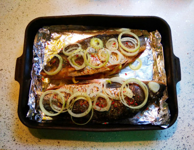 Смажьте рыбу растительным маслом и выложите на большой лист фольги. Все секреты использованию фольги вы можете узнать из отдельной статьи. Ссылка есть в конце этого рецепта.