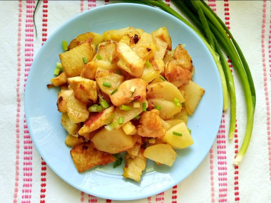 Жареную картошку с курицей на сковороде я приготовила на обед. Подготовилась к этому заранее, а точнее замариновала куриную грудку с солью, куркумой и травами. А на следующий день пожарила ароматные кусочки на сковороде до румяности. Потом добавила картошку, промытую от крахмала и обсушенную полотенцем. Минут через 15 выложила лук и жарила все до аппетитной золотистой корочки. Посолила уже готовую картошку. Получилось очень вкусно! Жареная картошка сытная, обеспечивает силами и хорошим настроением надолго! Замечу, что грудка немного суше, чем окорочка. Поэтому, если хотите мясо помягче, берите бедра или голени.