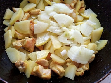 Лук очистите от шелухи, произвольно нарежьте и добавьте к картошке с курицей. Добавьте по вкусу соль и перец. Не накрывая сковороду крышкой, жарьте картошку с курицей до готовности, постоянно перемешивая.