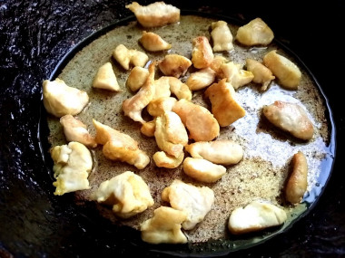 В глубокой сковороде разогрейте растительное масло и обжарьте в нём с каждой стороны мякоть курицы. Сковороду лучше брать хорошую, на которой картошка не будет пригорать. В тонкостях выбора сковороды и масла для жарки вам помогут разобраться статьи на эти темы. Ссылки на них есть в конце этого рецепта.
