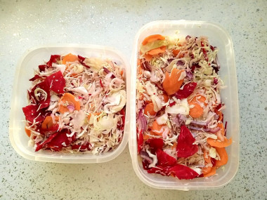 Готовую капусту переложите в банки. Капусту можно сразу переложить после остывания и отправить на маринование в холодильник в банках.