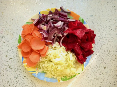 Увидела на сайте очень необычное название маринованной капусты. И приступила к приготовлению кремлевской хряпы закуски капустной) Честно говоря мне совершенно не хотелось резать все вручную. Решила впервые воспользоваться новой шинковкой на мясорубке. Морковь и свеклу она натерла тончайшими слайсами. А капусту тонкой паутинкой. Так все и оставила, мне кажется интересно выглядит. Рассола сварила в два раза больше. В рецепте совсем нет специй, но я все же положила по одному листику лаврушки на контейнер. Ещё один момент: я знаю, что при использовании свеклы вся закуска станет ярко розовой. Мне хотелось немного изменить цвет и я промыла натертую свеклу. В итоге закуска получилась нежно-розового цвета. Нам понравился и цвет и вкус! За два дня в холодильнике овощи стали хрустящими и очень вкусными! Сразу предупрежу, что сахара по рецепту много, если не любите сладкую капусту, то убавьте количество на свой вкус.