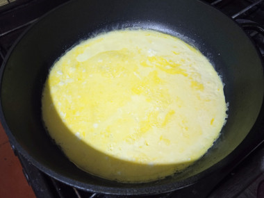 В сковороде на среднем огне разогрейте растительное масло. Вылейте в сковороду яичную смесь. Уменьшите огонь до минимального. Далее жарьте омлет под крышкой до готовности или можете аккуратно перевернуть омлет на другую сторону. Для этого переложите его на плоскую тарелку, а затем с тарелки переверните на сковороду. Прожарьте омлет еще примерно 1 минуту и выключите огонь.