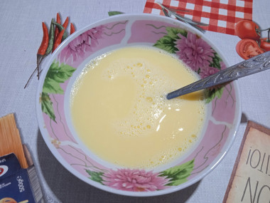 Влейте в яйца воду, всыпьте соль. Соль используйте мелкого помола. Крупные кристаллики могут плохо раствориться и потом хрустеть на зубах Взбейте все вилкой или венчиком до однородности. Долго взбивать не нужно. Достаточно, чтобы белок и желток соединились с водой, а также растворилась соль.