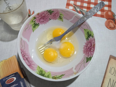 Яйца разбейте в глубокую миску. Если яйца мелкие, возьмите 3 штуки. В зависимости от диаметра вашей сковороды омлет получится тоньше или толще. Если вам нужен более высокий омлет, то сковороду берите диаметром около 16 см. У меня сковорода диаметром 20 см.