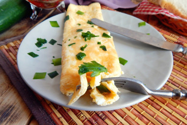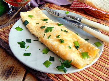 Переложите готовый омлет на тарелку, посыпьте свежей зеленью и подайте к столу. Приятного аппетита!