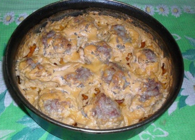Выложите подготовленные ёжики на обжаренные лук с морковью, лучше выкладывать в один слой, чтобы они потом были полностью покрыты соусом.