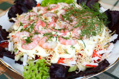 Классический: В большом салатнике, украшенный веточками укропа и целыми креветками.