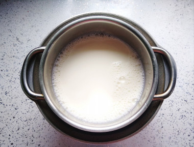 Молоко влейте в кастрюлю, поставьте на огонь и доведите до кипения. Следите чтобы не убежало! Пенку лучше снять.