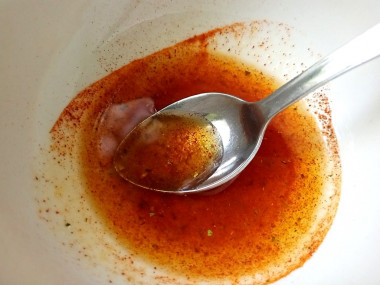 За это время подготовьте ароматную пропитку для сухариков: смешайте в миске растительное масло, специи - в данном случае яиспользовала свежемолотую смесь перцев. Добавьте далее соль и выдавленный через чеснокодавку чеснок очищенный предварительно от шелухи. Количество чеснока и специй можете корректировать и добавлять столько, сколько вам нравиться.