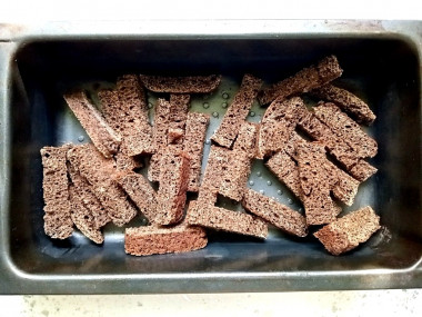 Сложите кубики черного хлеба в форму для запекания. Поставьте сухарики в предварительно разогретую до 160-180 градусов и запекайте их минут 20. Сразу сильно запекать не нужно, необходимо только хорошо подсушить хлеб.