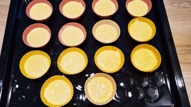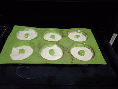 В форму для выпечки вложите бумажные формочки для кексов. Переложите тесто в кондитерский мешок и выложите его в формочки, заполняя их на 2/3. Если нет кондитерского мешка, используйте столовую ложку. О том, как выбрать форму для запекания, читайте в отдельной статье по ссылке в конце рецепта.