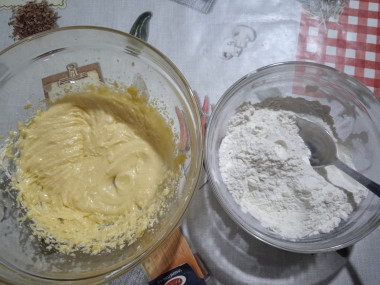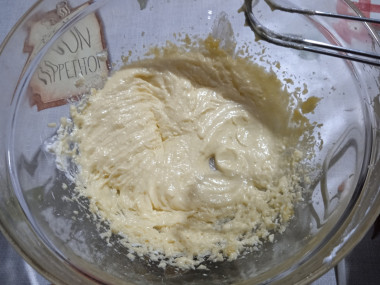 Вбейте по одному куриные яйца в сахарно-масляную смесь, каждый раз перемешивая миксером на небольших оборотах.