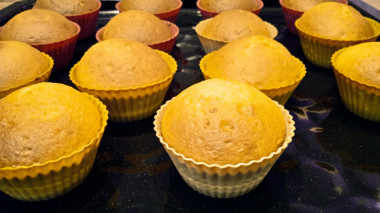 Поставьте форму с маффинами в разогретую духовку и выпекайте 15-20 минут до золотистой корочки. Проверить готовность можно, проткнув маффины зубочисткой. Если тесто остается на зубочистке - она должна остаться сухой.